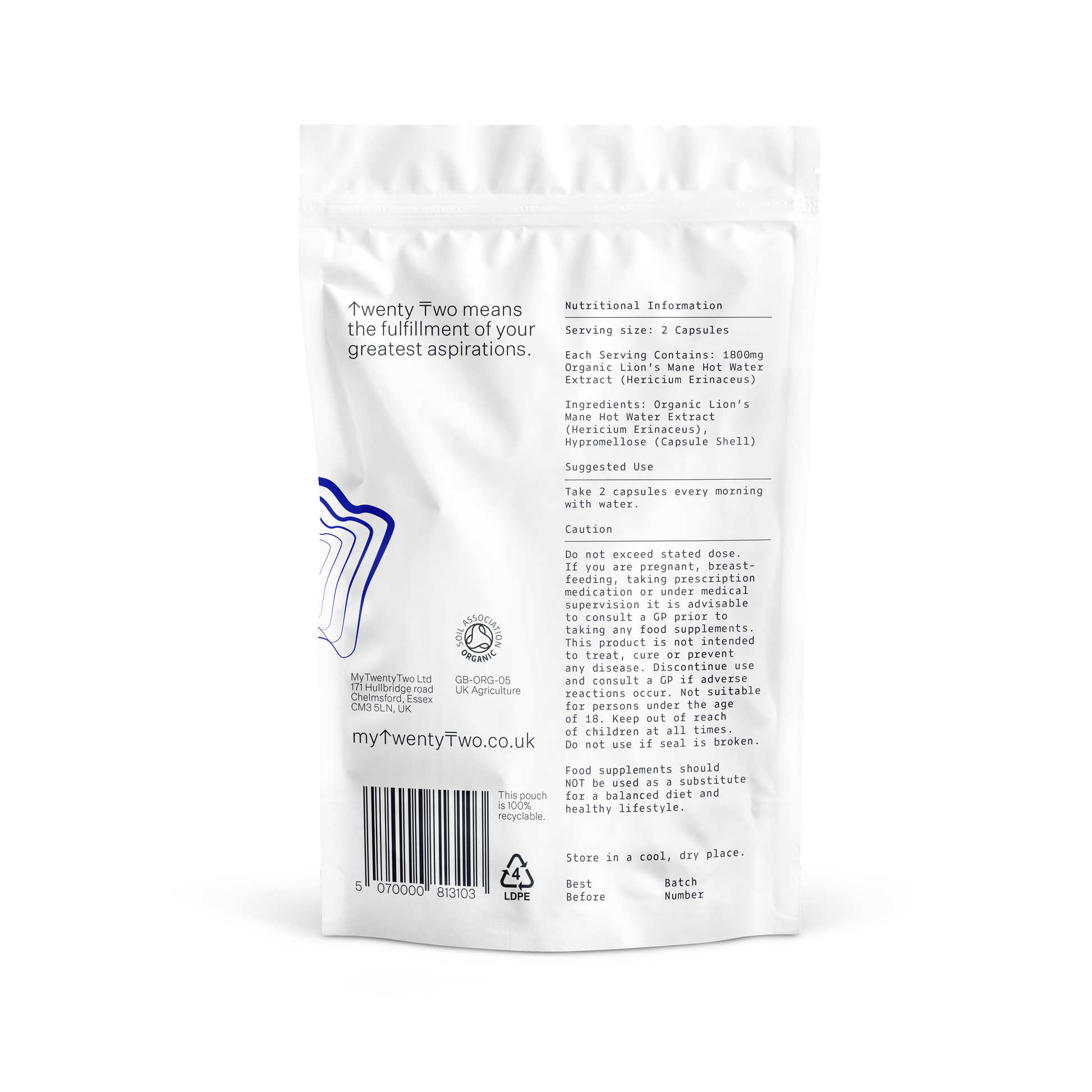 One serving of TwentyTwo's Lion's Mane contains 1,800mg of pure, organic Lion's Mane mushroom fruiting body extract.